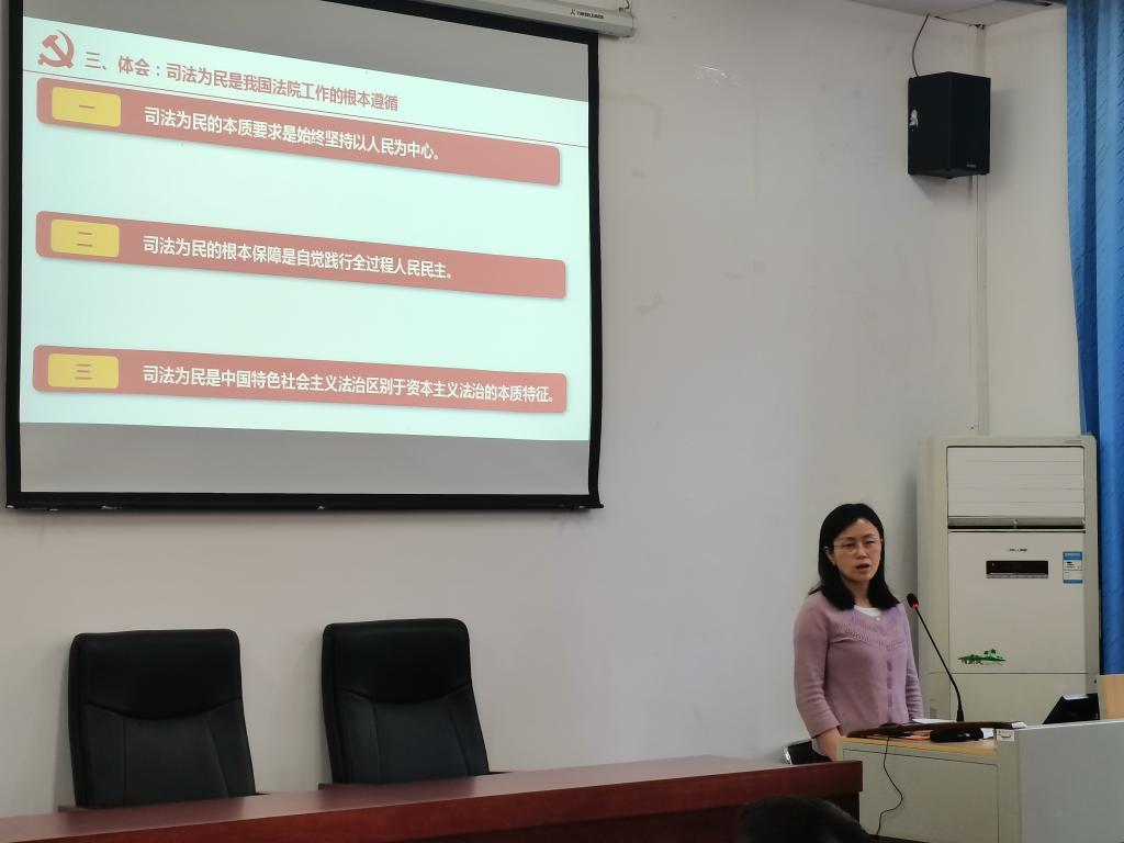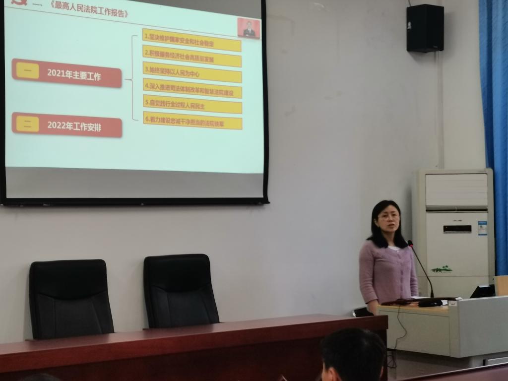 學(xué)習(xí)會(huì)上,楊樺老師主要從三個(gè)方面進(jìn)行了領(lǐng)學(xué):一是介紹兩會(huì)概況,概述了2022年全國(guó)兩會(huì)的工作內(nèi)容及熱點(diǎn)話(huà)題;二是根據(jù)自己的專(zhuān)業(yè)背景重點(diǎn)闡釋了《最高人民法院工作報(bào)告》;三是從“司法為民的本質(zhì)要求是始終堅(jiān)持以人民為中心、司法為民的根本保障是自覺(jué)踐行全過(guò)程、人民民主司法為民是中國(guó)特色社會(huì)主義法治區(qū)別于資本主義法治的本質(zhì)特征”三個(gè)方面給大家分享了自己學(xué)習(xí)全國(guó)兩會(huì)精神的心得體會(huì),并強(qiáng)調(diào)了本年度工作報(bào)告的亮點(diǎn)之一在于突出強(qiáng)調(diào)司法為民的根本原則地位,多角度闡釋了上年度法院努力踐行司法為民的主要舉措,滿(mǎn)足人民群眾對(duì)美好生活和公平正義向往的需要。
