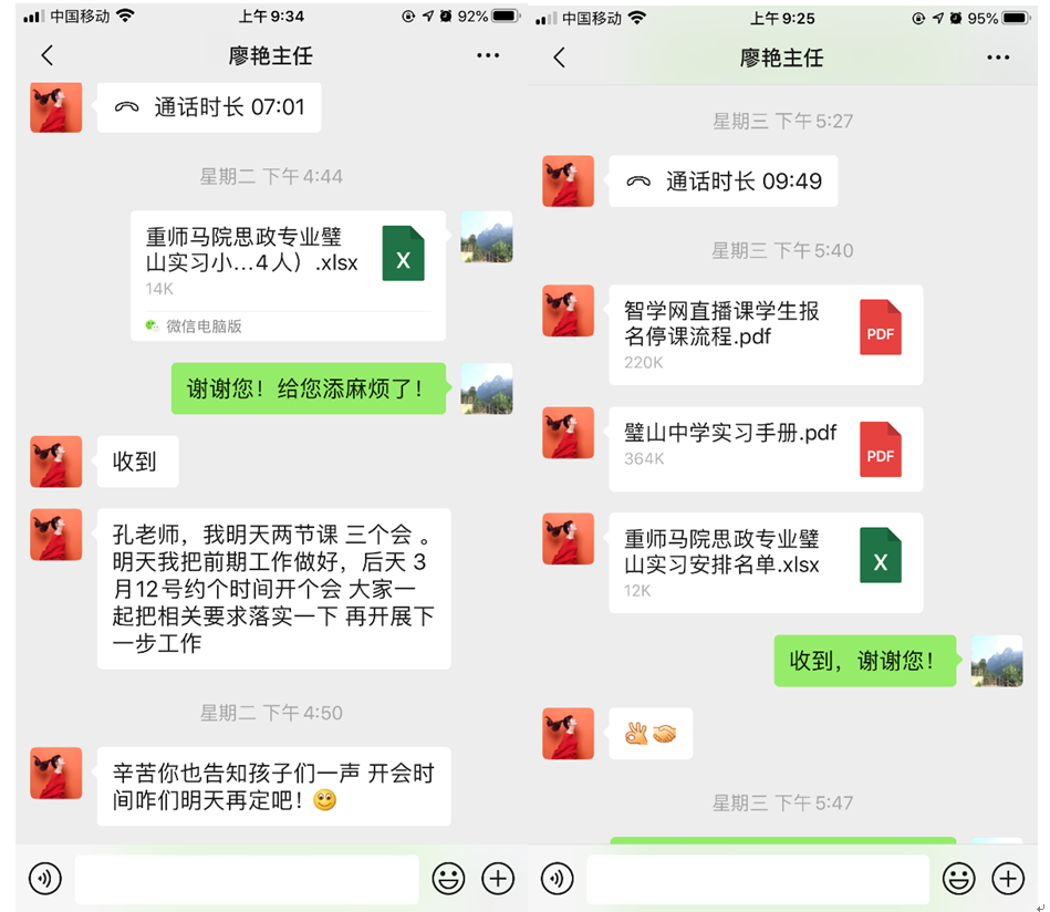 在疫情影響下,秉持著“停課不停學”的原則,重慶市璧山中學于3月2日便啟動了線上教學,而我們也開始了一次別開生面的實習之旅。3月5日,我們的實習帶隊老師孔慶茵老師與璧山中學廖艷主任進行了有關實習工作安排的交流,并邀請璧山中學參與此次實習的老師入群。隨后小組確定實習規(guī)章制度、進行實習小組分工等工作。廖主任發(fā)來了智學網(wǎng)直播課學生報名聽課流程、璧山中學實習手冊、重師馬院思政專業(yè)璧山實習安排(落實指導教師、登錄科大訊飛平臺聽課的賬號密碼)。并于3月12日以騰訊線上會議的形式召開了實習見面會。