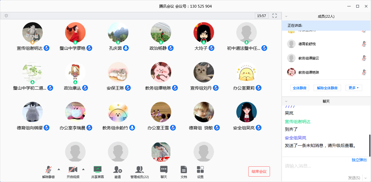 前些日子璧山中學的老師們還在為網(wǎng)課忙得不可開交,這幾日便已經(jīng)把實習的工作安排得明明白白。3月12日我們在疫情期間首次以如此正式的方式與璧山中學的各位老師取得了聯(lián)系,在會議上廖主任、吳主任相繼發(fā)言,強調(diào)了線上實習的相關注意事項,著重要求我們注意實習期間的安全問題,耐心地聽取了同學們關于實習的問題并做出解答……璧山中學的老師們對于前來實習的我們抱有很大的期望,對我們關切有加。我們也一定把握這次寶貴的實習機會,觀摩、學習、反思,就像廖主任提到的,多去想想“如果是我,我應該怎么去做”。