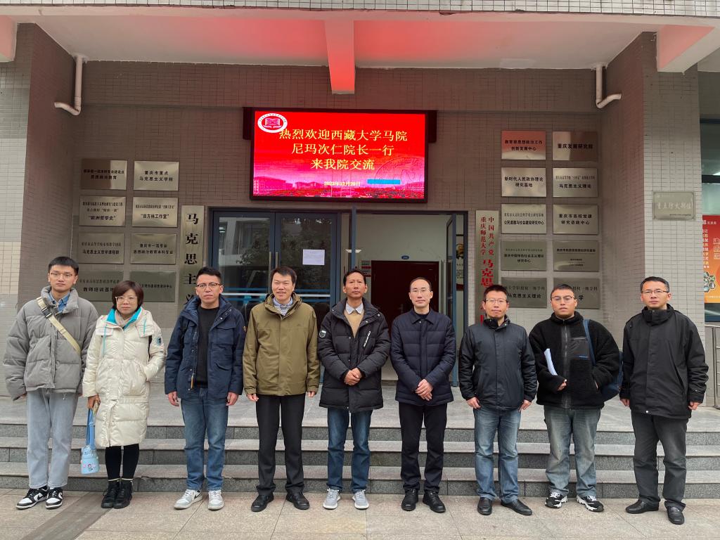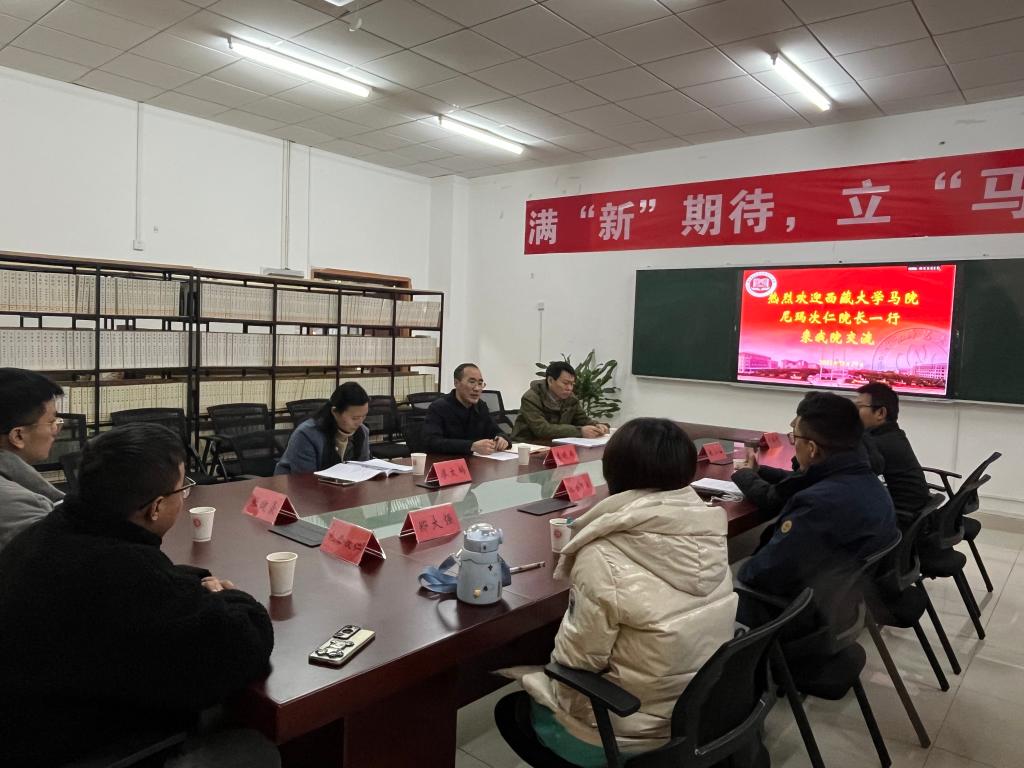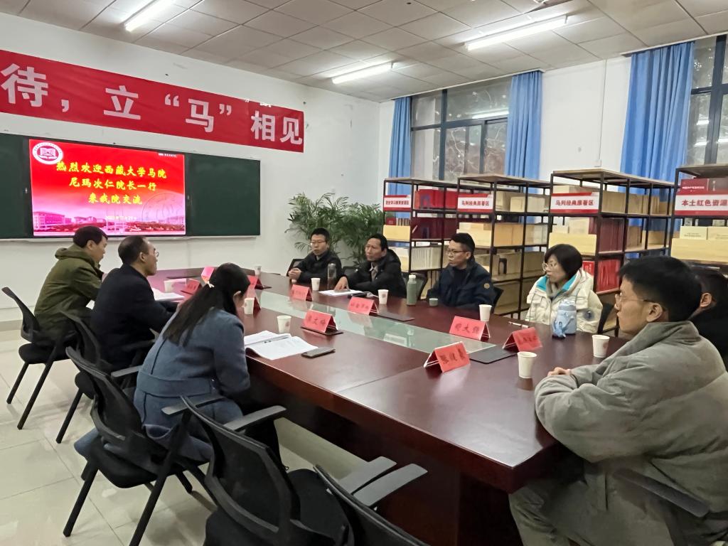 2023年12月29日,西藏大學馬克思主義學院尼瑪次仁院長一行近10人到我院進行了交流座談。會議在學院匯賢樓107會議室舉行。學院黨委書記李曉燕、副院長姜土生、黨政辦公室主任廖文梅等參加了會議,會議由我院黨委書記李曉燕主持。