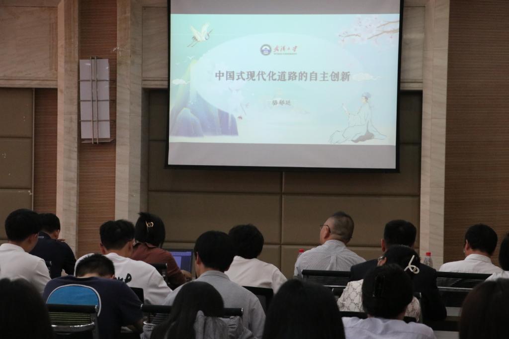 駱郁廷教授圍繞“國家獨(dú)立和自主探索相結(jié)合的現(xiàn)代化道路創(chuàng)新”“普遍真理與具體實(shí)踐相結(jié)合的現(xiàn)代化道路創(chuàng)新”“社會(huì)主義和市場經(jīng)濟(jì)相結(jié)合的現(xiàn)代化道路創(chuàng)新”“創(chuàng)新為主與借鑒為輔相結(jié)合的現(xiàn)代化道路創(chuàng)新”四部分內(nèi)容,就中國式現(xiàn)代化道路的自主創(chuàng)新同在座師生分享交流。同時(shí),駱郁廷教授強(qiáng)調(diào)深入分析、揭示和把握中國式現(xiàn)代化的本質(zhì)特征對于全面深刻理解和堅(jiān)定不移走中國式現(xiàn)代化道路,以推進(jìn)社會(huì)主義現(xiàn)代化強(qiáng)國建設(shè),實(shí)現(xiàn)中華民族偉大復(fù)興具有重大意義。隨后,駱郁廷教授勉勵(lì)我院學(xué)子在中國式現(xiàn)代化道路上繼續(xù)堅(jiān)持自主創(chuàng)新,以助力我國現(xiàn)代化建設(shè)取得更大成就。