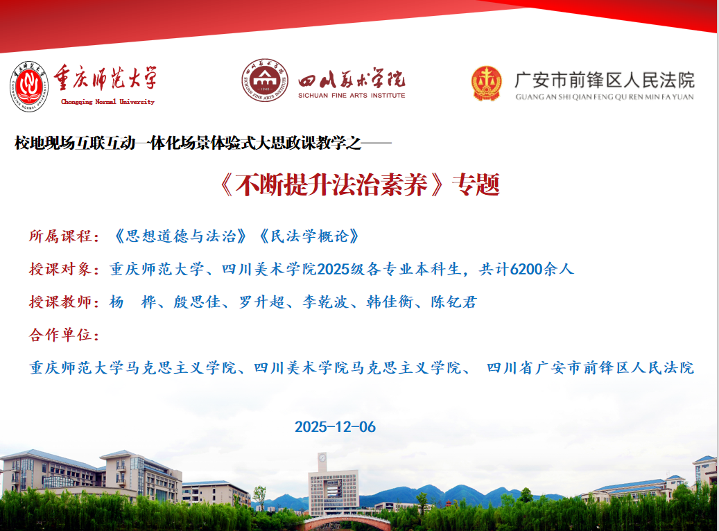 12月6日,在學(xué)校黨委宣傳部、教務(wù)處的指導(dǎo)下,在校團(tuán)委、學(xué)生處、信息技術(shù)中心和校內(nèi)各學(xué)院的配合下,我院聯(lián)合四川美術(shù)學(xué)院馬克思主義學(xué)院、四川省廣安市前鋒區(qū)人民法院,運(yùn)用現(xiàn)代遠(yuǎn)程教育技術(shù)手段,在65個(gè)智慧教室里,面向我院2023級(jí)思想政治教育專(zhuān)業(yè)(含“師范教育協(xié)同提質(zhì)計(jì)劃”)、我校和四川美術(shù)學(xué)院2025級(jí)各專(zhuān)業(yè)6200余名本科學(xué)生,同步“云”端開(kāi)展多會(huì)場(chǎng)聯(lián)動(dòng)的校內(nèi)外一體化場(chǎng)景體驗(yàn)式“大思政課”教學(xué)活動(dòng)。