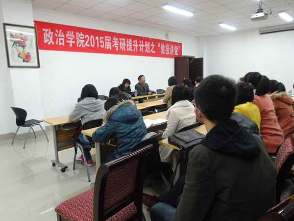 隨著2015屆考研號(hào)角緩緩吹響,我院對(duì)2011級(jí)學(xué)子的考研工作高度重視。2014年3月14日晚19點(diǎn),政治學(xué)院在集賢樓334開展了2015年考研指導(dǎo)講座。我院胡政武老師特邀重慶師范大學(xué)數(shù)學(xué)系89級(jí)校友,現(xiàn)任重慶工商大學(xué)管理學(xué)教授、校研究所所長(zhǎng)黃鐘儀老師為2011級(jí)全體考研學(xué)子做考研指導(dǎo)。