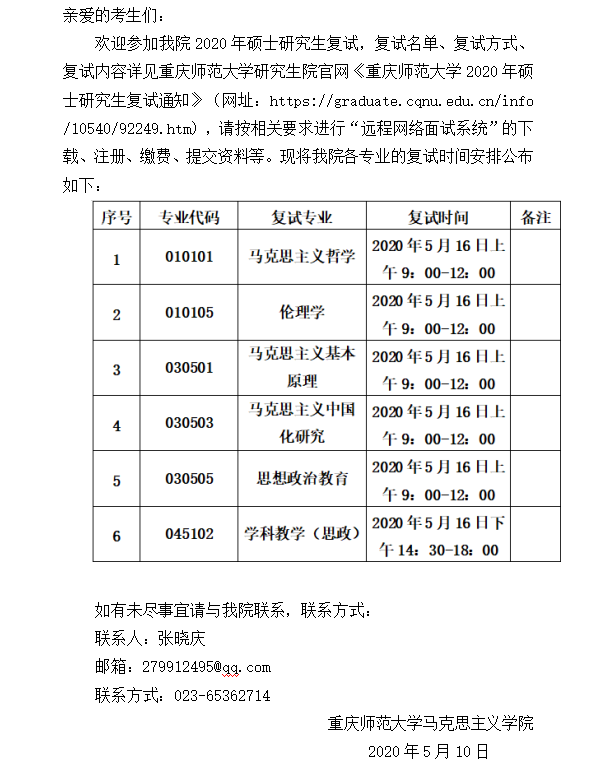 重慶師范大學馬克思主義學院2020年碩士研究生復試通知