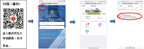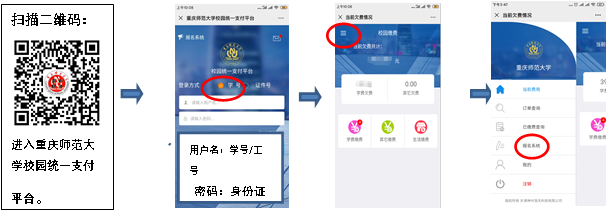 校內(nèi)考生掃描二維碼用學號登錄報名系統(tǒng),選擇報名項目后即可報名繳費;校外考生掃描二維碼進入報名系統(tǒng),選擇報名項目后需先注冊后再報名繳費。