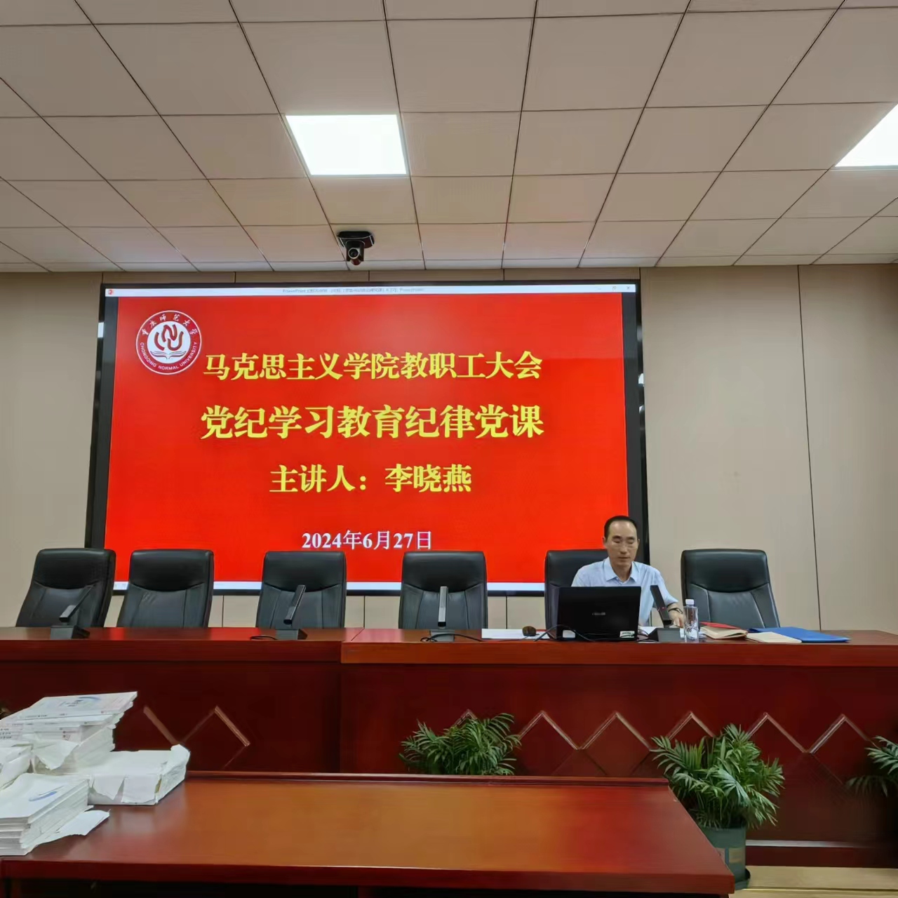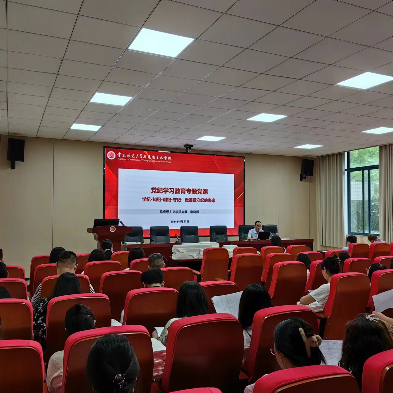 為強化黨的政治建設(shè),加強黨的紀(jì)律教育,我院黨委于6月27日下午在學(xué)院106報告廳召開全院教職工大會,院黨委書記李曉燕主持會議并講黨紀(jì)學(xué)習(xí)教育紀(jì)律黨課。全院教師參加會議。