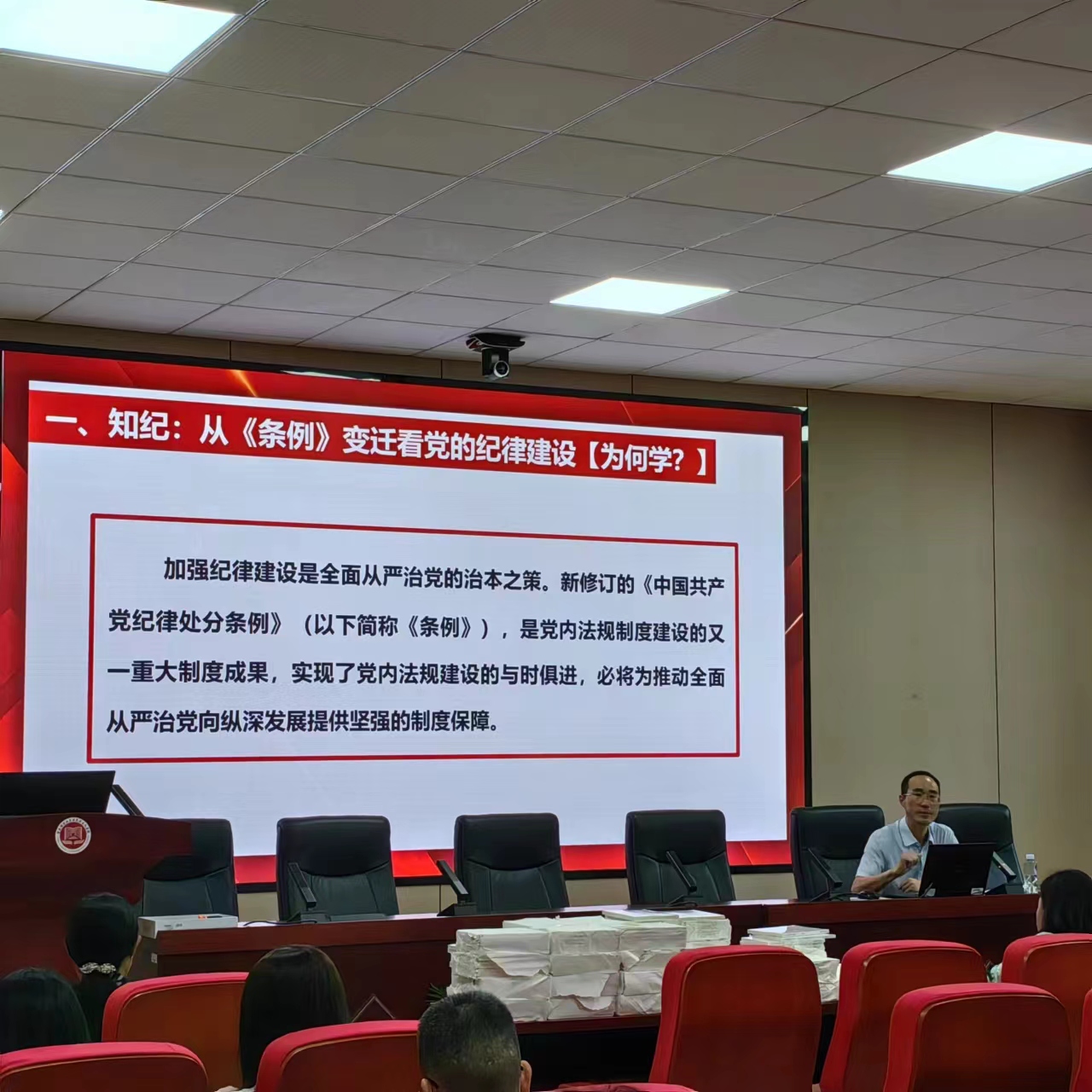 本次紀(jì)律黨課的題目是“學(xué)紀(jì)·知紀(jì)·明紀(jì)·守紀(jì):做遵章守紀(jì)的表率”。李曉燕從知紀(jì):從《條例》變遷看黨的紀(jì)律建設(shè),明紀(jì):黨紀(jì)學(xué)習(xí)教育的重點內(nèi)容,學(xué)紀(jì):黨紀(jì)學(xué)習(xí)教育的方法論,守紀(jì):黨紀(jì)學(xué)習(xí)教育的實踐要義四個方面詳細闡述了黨紀(jì)學(xué)習(xí)教育為什么學(xué)、學(xué)什么、如何學(xué)、怎么做。李曉燕指出,《中國共產(chǎn)黨紀(jì)律處分條例》(下簡稱《條例》)自頒布以來歷經(jīng)四次修訂,其總則的內(nèi)容積極貫徹落實黨的重要理論、路線、方針、政策,體現(xiàn)了高度的政治性;分則的內(nèi)容與時俱進,符合監(jiān)督執(zhí)紀(jì)的現(xiàn)實需要;附則的內(nèi)容則體現(xiàn)了以人為本的根本宗旨。新修訂的《條例》其主要內(nèi)容可以概括為“一二三四五六”,即一個指導(dǎo)思想、兩個堅決維護、三個責(zé)任區(qū)分、四種監(jiān)督形態(tài)、五個加重情形、六大違紀(jì)行為。他表示,黨員干部要端正態(tài)度、真心誠意的堅持原原本本學(xué)、堅持聯(lián)系實際學(xué)、堅持突出重點學(xué),通過學(xué)習(xí)得到自我凈化、自我完善、自我革新、自我提高。