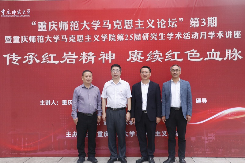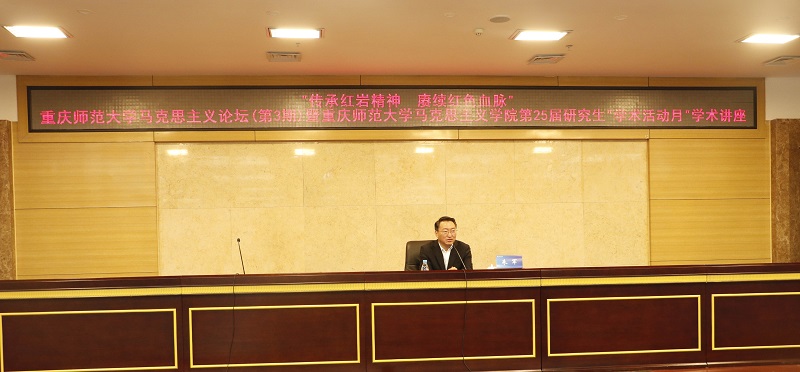為進(jìn)一步深入學(xué)習(xí)黨史,加強(qiáng)大學(xué)生的愛國(guó)主義教育,引導(dǎo)學(xué)生更加堅(jiān)定馬克思主義信仰,2021年10月13日上午9:00,重慶師范大學(xué)馬克思主義學(xué)院于博雅樓504會(huì)議廳舉辦重慶師范大學(xué)馬克思主義論壇(第3期)暨重慶師范大學(xué)馬克思主義學(xué)院第25屆研究生學(xué)術(shù)活動(dòng)月學(xué)術(shù)講座。本次論壇特邀重慶紅巖聯(lián)線文化發(fā)展管理中心黨委書記朱軍教授作主題為“傳承紅巖精神 賡續(xù)紅色血脈”的學(xué)術(shù)報(bào)告。馬克思主義學(xué)院黨政班子、教師代表和21級(jí)全體研究生、本科生聽取了此次講座。講座由馬克思主義學(xué)院黨委書記劉軍主持。