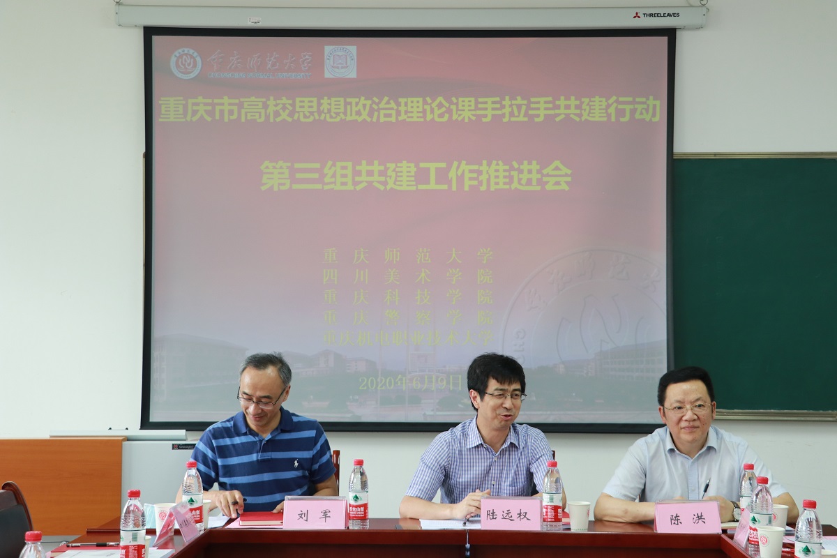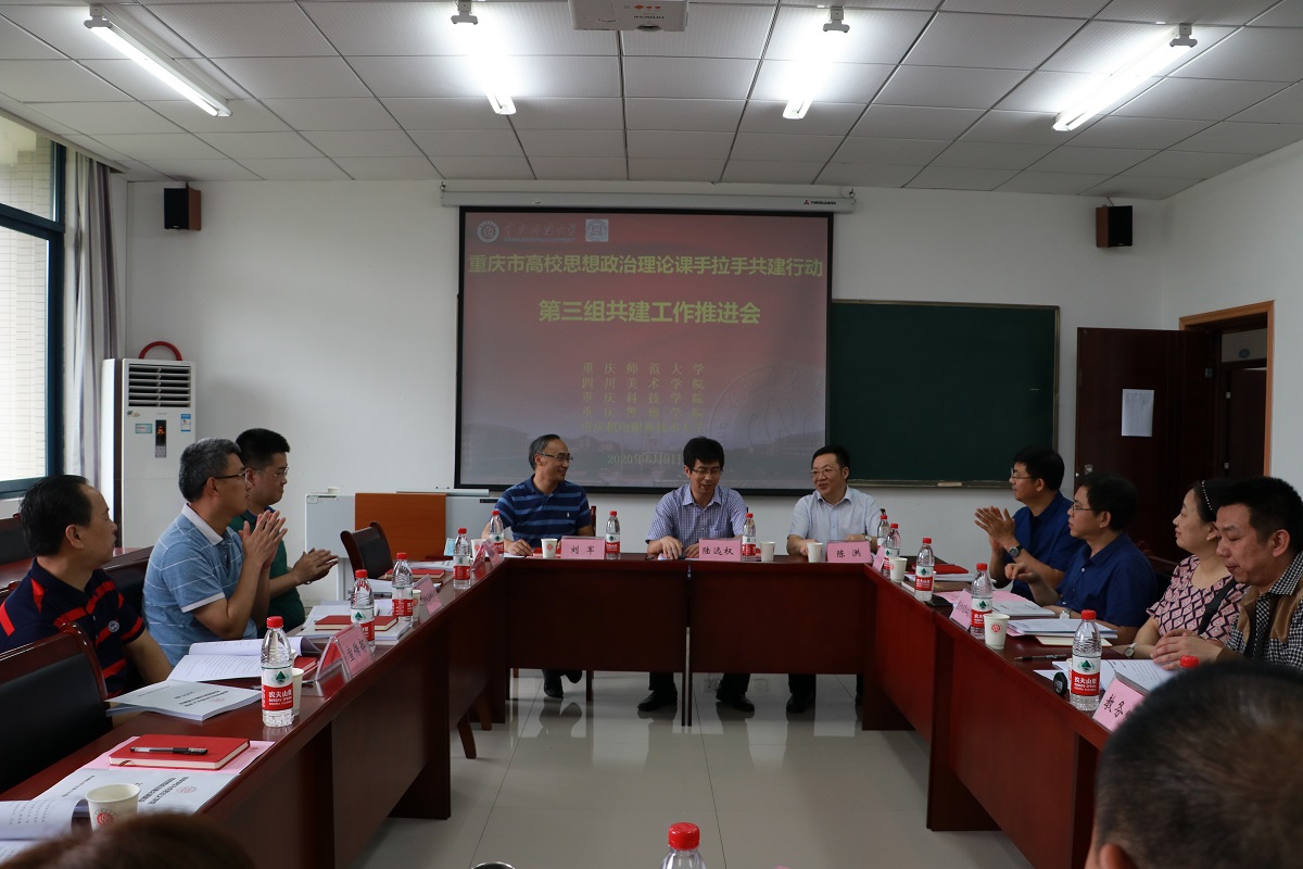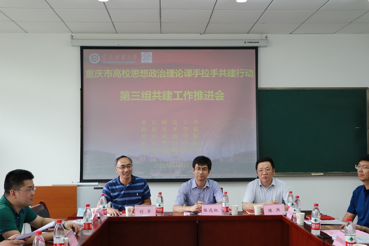 為深入貫徹落實《中共重慶市委教育工作委員會辦公室、重慶市教育委員會辦公室關(guān)于開展高校思想政治理論課手拉手共建行動的通知》(渝教工委函〔2020〕5號)精神,加強高校思政課教師隊伍建設(shè),落實立德樹人根本任務(wù),發(fā)揮思政課鑄魂育人的主渠道作用,增強思政課的思想性、理論性、針對性、實效性和親和力,提高思政課教學(xué)和育人質(zhì)量,培養(yǎng)德智體美勞全面發(fā)展的中國特色社會主義建設(shè)者和接班人,2020年6月9日下午,重慶市高校思想政治理論課“手拉手”共建行動第三組共建工作推進會第一次會議在組長單位重慶師范大學(xué)馬克思主義學(xué)院順利舉行。重慶師范大學(xué)黨委常委、副校長陸遠權(quán)教授及校黨委宣傳部、教務(wù)處負責(zé)人出席會議,第三組成員高校重慶師范大學(xué)、四川美術(shù)學(xué)院、重慶科技學(xué)院、重慶警察學(xué)院、重慶機電職業(yè)技術(shù)大學(xué)分別派馬克思主義學(xué)院領(lǐng)導(dǎo)、思政教學(xué)部負責(zé)人參會。會議由重慶師范大學(xué)馬克思主義學(xué)院黨委書記劉軍同志主持。