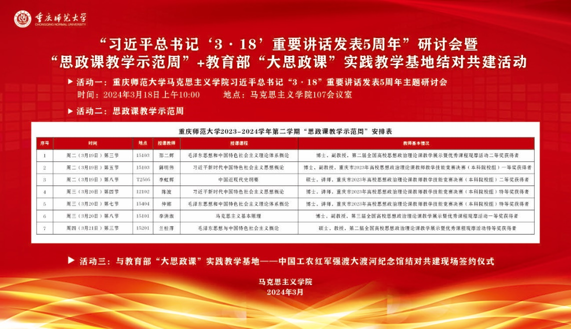 3月19日下午第八節(jié)課,中國近現(xiàn)代史綱要教研室李虹輝老師在特教樓2505教室進(jìn)行現(xiàn)場教學(xué)展示活動。李虹輝老師在重慶市2023年高校思想政治理論課教師教學(xué)技能競賽決賽(本科院校組)中榮獲二等獎(jiǎng)。本次教學(xué)展示活動系重慶師范大學(xué)馬克思主義學(xué)院紀(jì)念習(xí)近平總書記“3·18”重要講話發(fā)表5周年系列活動之一。