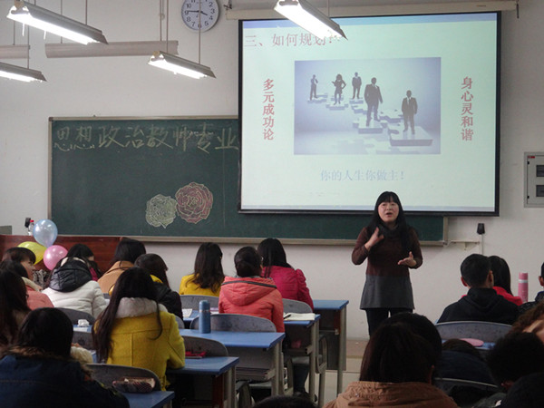 師范生教育期即教師職前培訓(xùn)期,作為教師職業(yè)生涯不可或缺的重要組成部分,如何依據(jù)教師教育特點,促其盡早規(guī)劃職業(yè)生涯就顯得十分重要。馬克思主義學(xué)院2013級思想政治教育專業(yè)于2014年3月14日下午2點30在弘德樓3205舉行了師范生職業(yè)生涯規(guī)劃講座,此次講座由重慶師范大學(xué)歷社學(xué)院陳春梅老師擔(dān)任主講,輔導(dǎo)員張曉慶主持講座,馬克思主義學(xué)院2013級全體學(xué)生出席。
