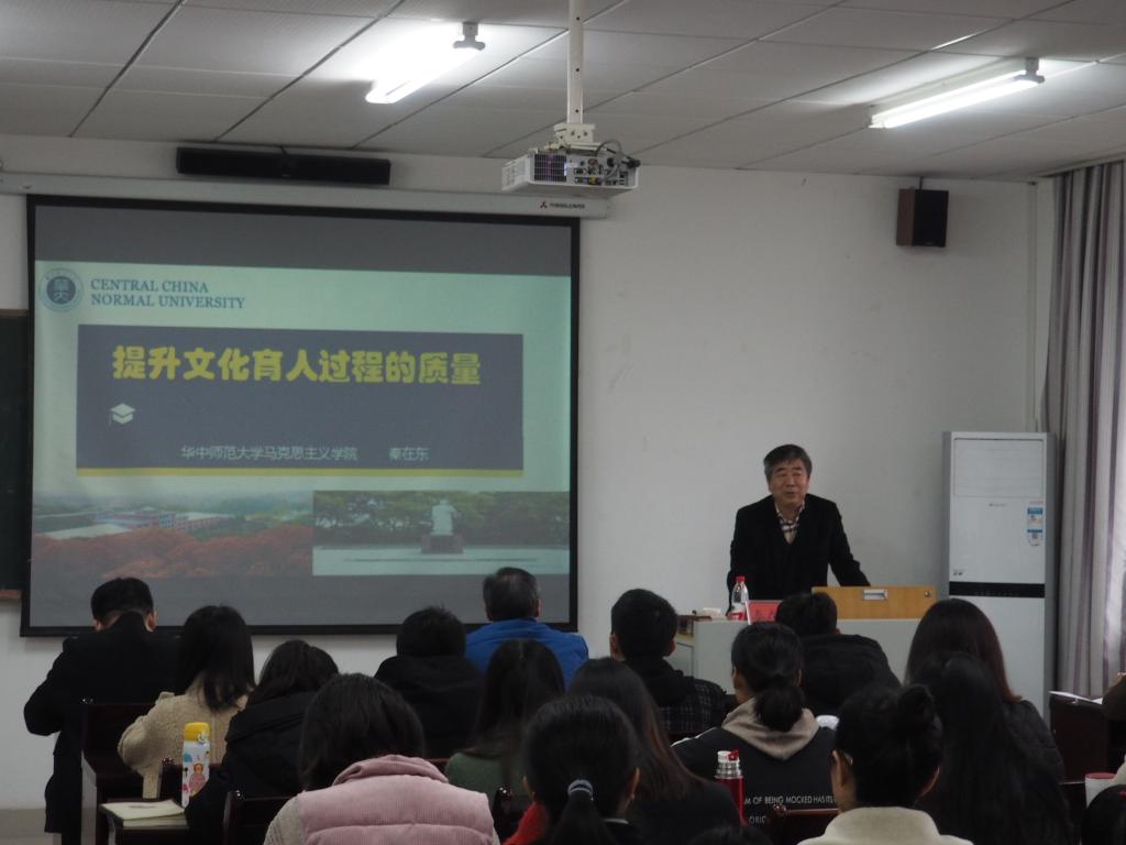 2019年3月11日上午,華中師范大學馬克思主義學院博士生導師、馬克思主義理論一級學科負責人、思想政治教育學科博士點負責人秦在東教授應我院邀請在匯賢樓201會議室作了題為“提升文化育人過程的質(zhì)量”的學術報告。我院部分教師與全體研究生共同聆聽本次報告,報告會由我院院長陳洪教授主持。
