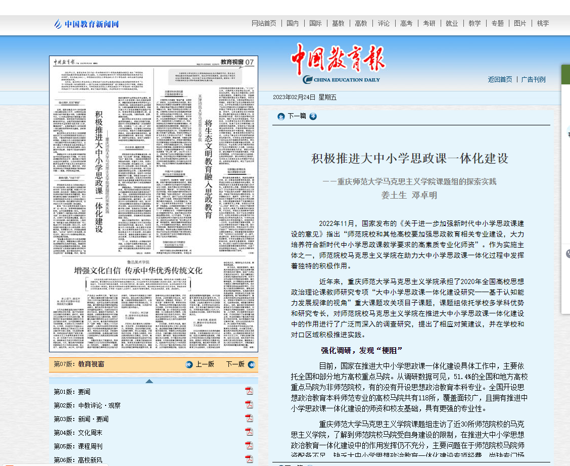 中國教育報:積極推進大中小學思政課一體化建設(shè)——重慶師范大學馬克思主義學院課題組的探索實踐
