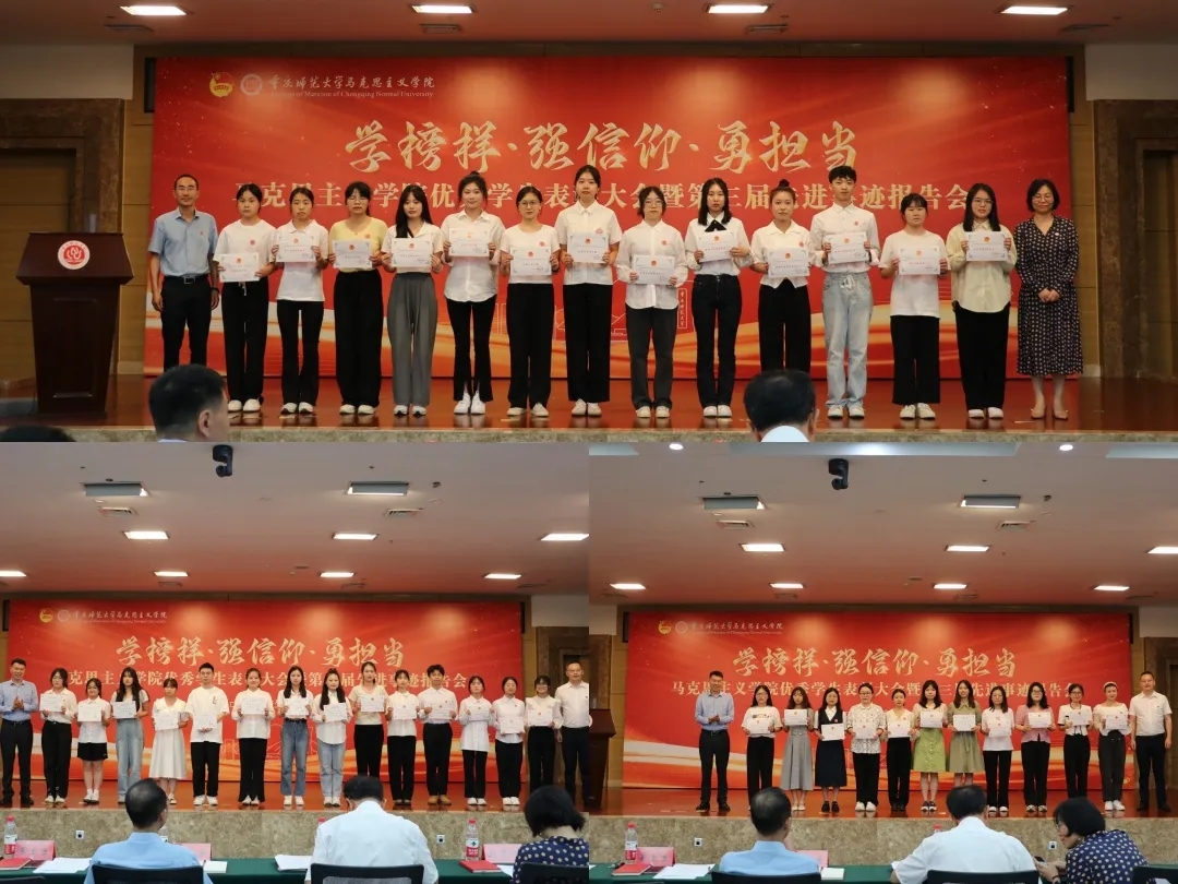 為表彰先進(jìn)、樹(shù)立典型,激發(fā)青年奮進(jìn)動(dòng)力,培養(yǎng)具有重師特色、馬院特色的時(shí)代新人,2023年6月1日14時(shí),重慶師范大學(xué)馬克思主義學(xué)院于博雅樓504創(chuàng)新廳舉辦“學(xué)榜樣·強(qiáng)信仰·勇?lián)?dāng)”第三屆先進(jìn)事跡報(bào)告會(huì)暨2022-2023學(xué)年度優(yōu)秀學(xué)生表彰大會(huì)。重慶師范大學(xué)黨委副書記陳志軍、校學(xué)生處副處長(zhǎng)趙秀娟,馬克思主義學(xué)院黨委書記李曉燕、副院長(zhǎng)姜土生、黨委副書記方敏及教師代表出席大會(huì),2022級(jí)全體本科生及本、碩各年級(jí)學(xué)生代表到場(chǎng)學(xué)習(xí)。